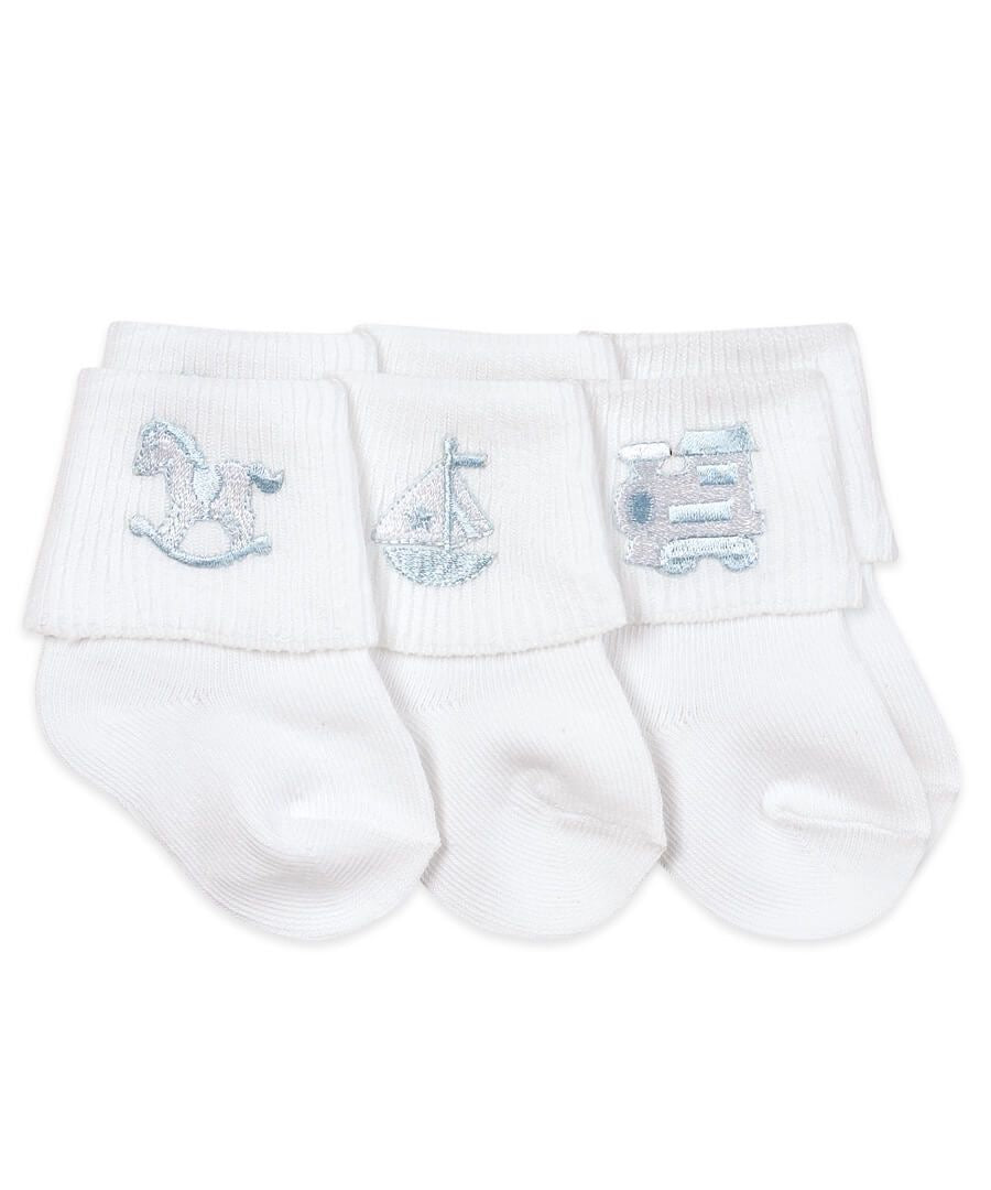 Baby boy classic white turn cuffs with light blue embroidered pattern appliques. In this 3 pair pack, you get 1 pair of rocking horse socks, 1 pair of sail boat socks, and 1 pair of train socks. These socks feature an ultra-smooth toe for added softness that provides unsurpassed comfort. These soft cotton socks are perfect for newborn babies, infants, and toddlers.
