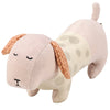 A soft plush toy displaying a charming dog design replicated from original block print style art. Dog baby toy features engaging sensory elements that encourage touch and play including a squeaker, soft ears, and embroidered details for the face.