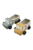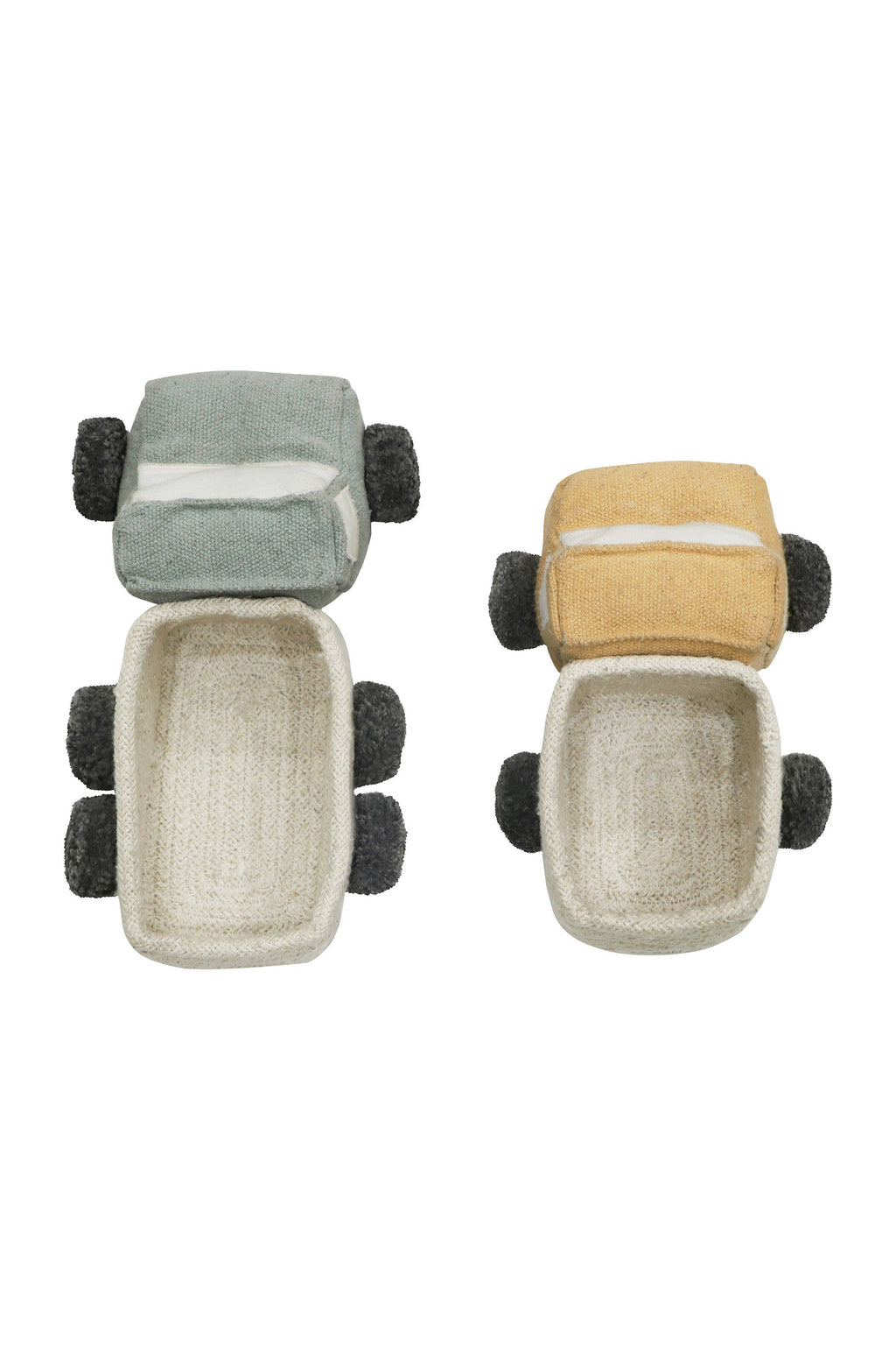 Set of two mini baskets in the shape of little trucks. The baskets are made in natural color braided cotton cords with handstitched truck cabs in cotton canvas and with cotton pom poms in dark grey as wheels. The set consist of one longer version in Vintage Blue color and one shorter in Honey color. Can be used as treasure guards, pencil holders or soft toys.