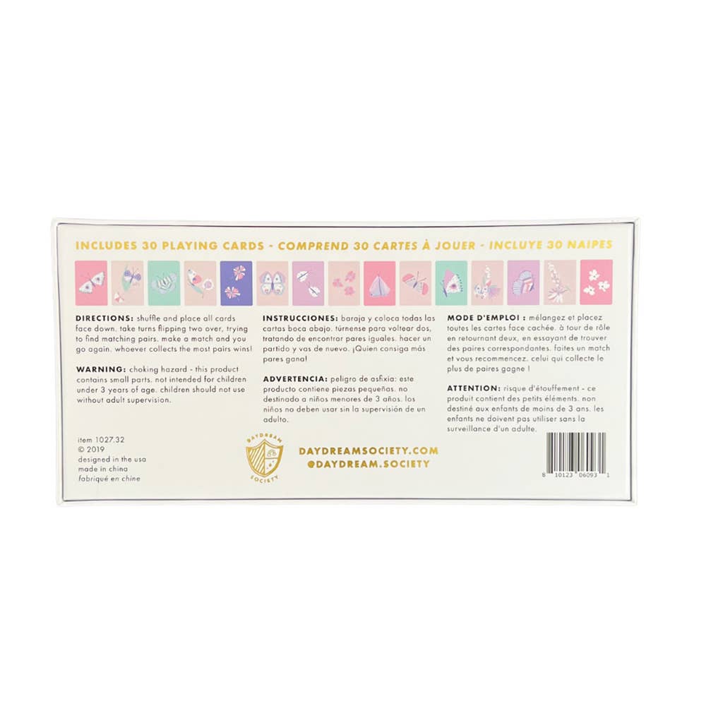 A classic memory-matching card game featuring beautiful butterflies! These cards are perfect for little hands. Have fun while encouraging memory, matching, and turn-taking skills. Whoever collects the most pairs wins! Illustrated Lilian Farag by Daydream Society Matching game for 2 - 6 players Includes 30 playing cards Not intended for children under 3 years old Adult supervision recommended